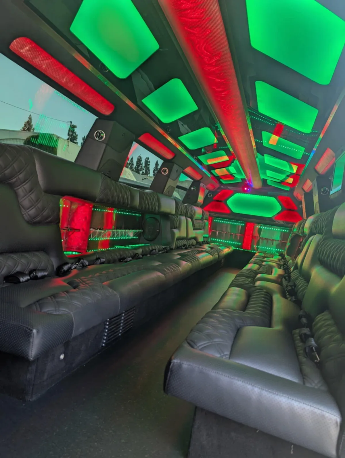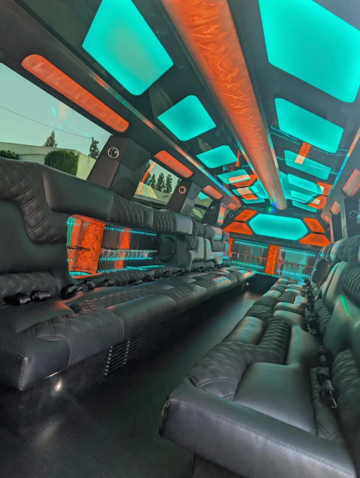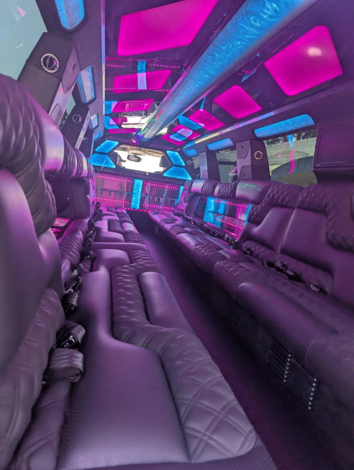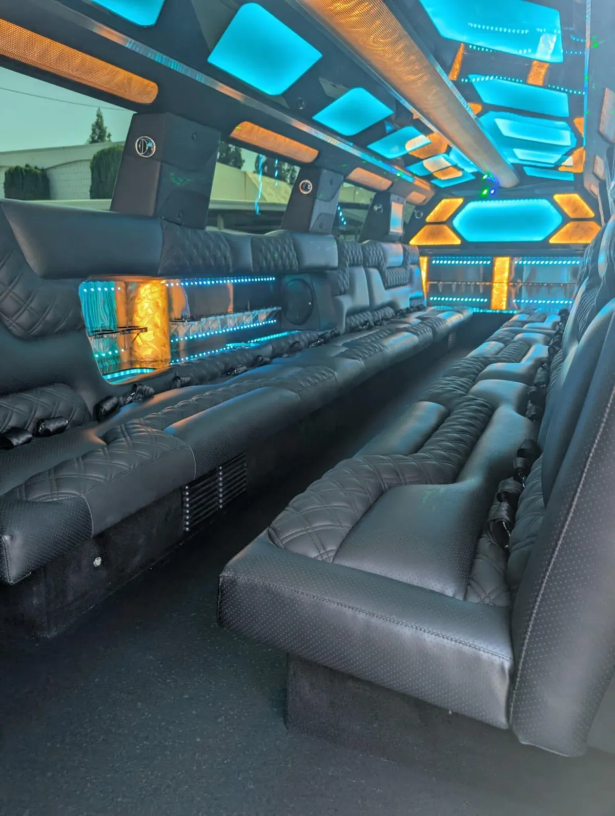 Limo features leather perimeter CD/DVD/ Bluetooth and aux hook up player with level 3 sound system million color led lighting bar areas with ice and glassware..