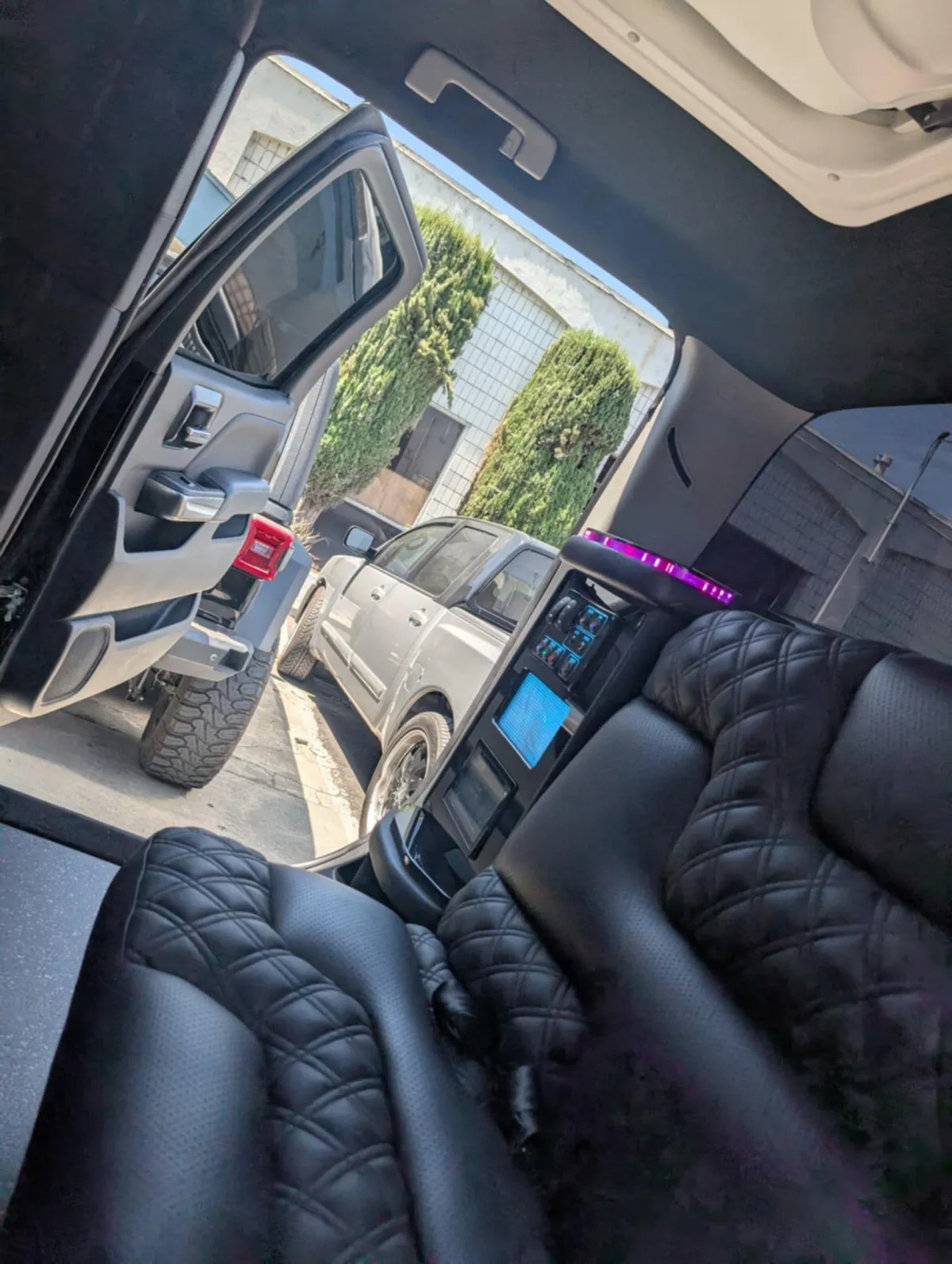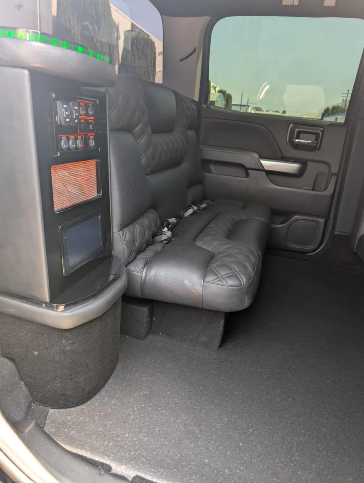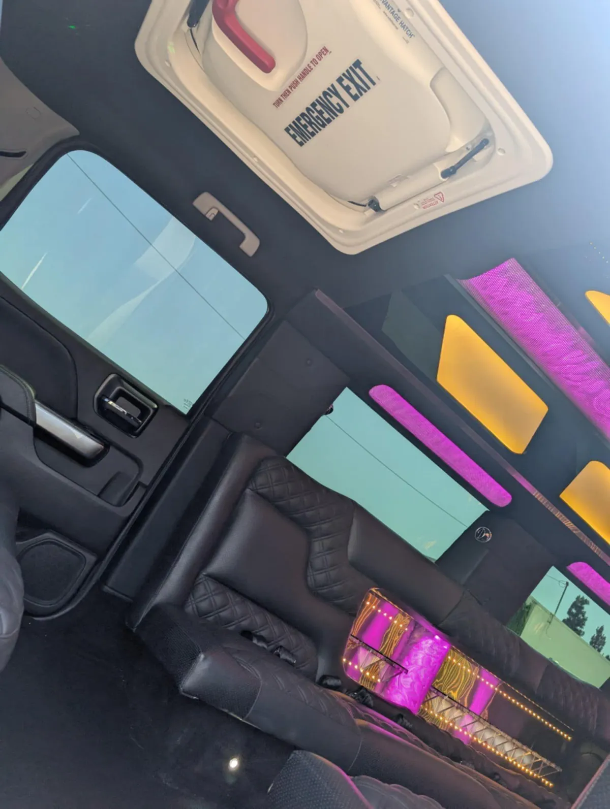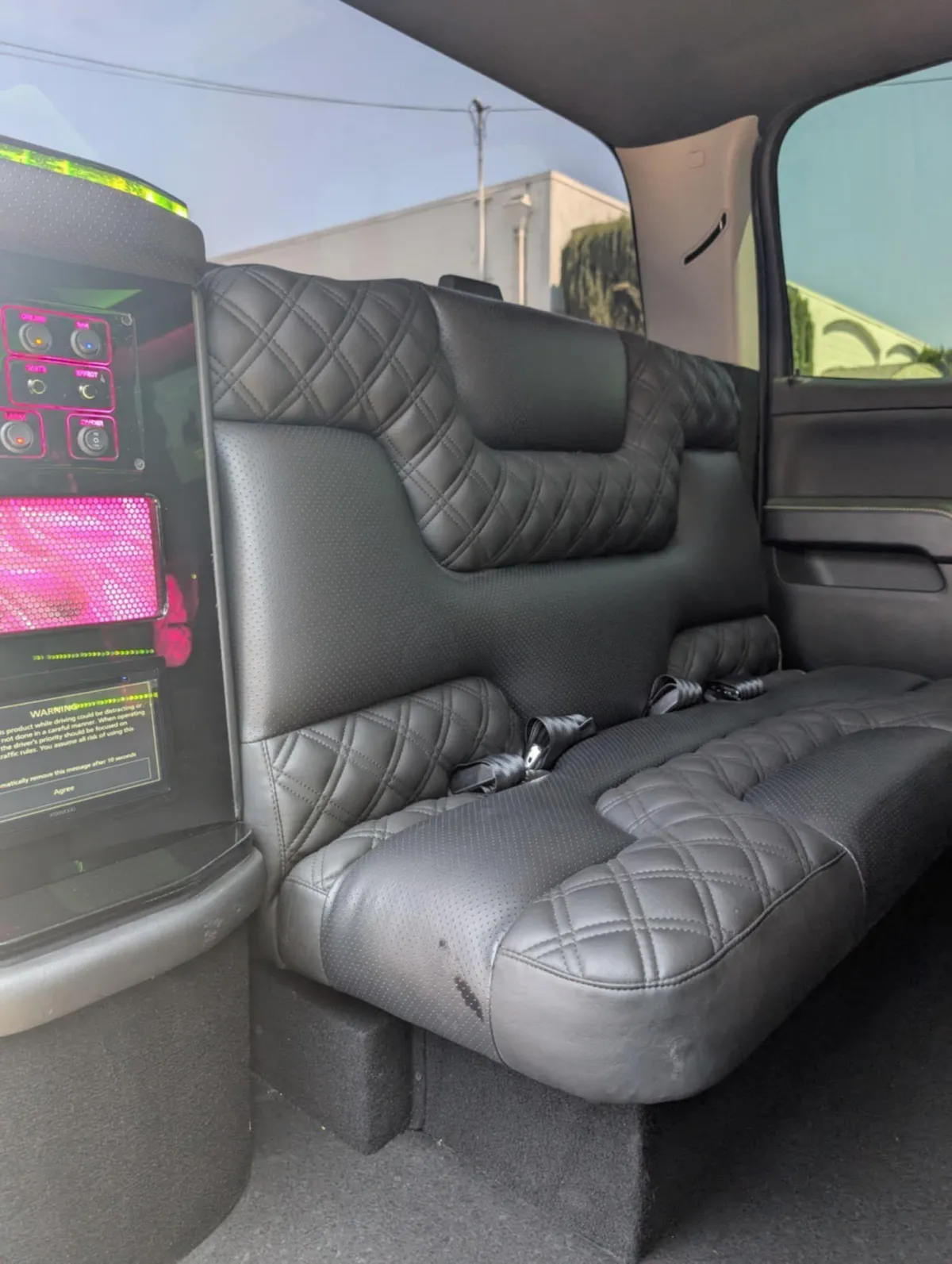 Limo features leather perimeter CD/DVD/ Bluetooth and aux hook up player with level 3 sound system million color led lighting bar areas with ice and glassware..